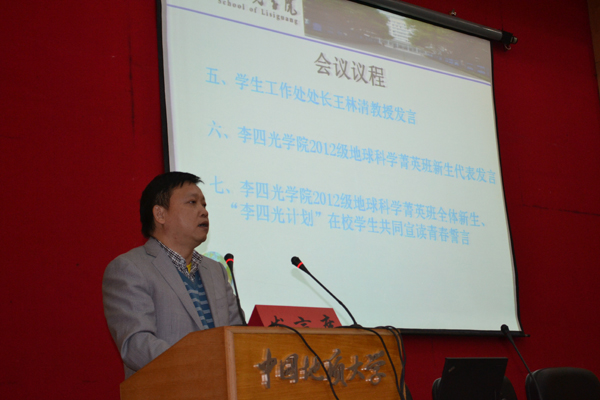 AWC万象城娱乐2012级新生尹然宇代表地球科学菁英班全体学生发言,表达了对学校的热爱,对学院的憧憬,对科学真理的向往和勇于探索的坚定信念。