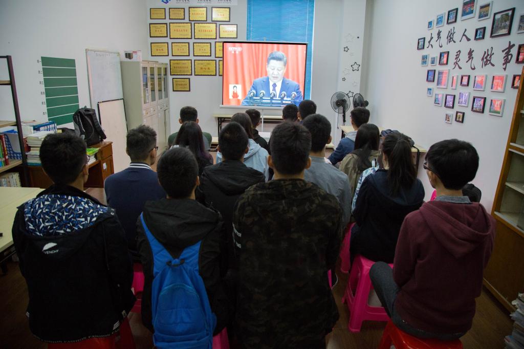 观看现场氛围浓厚,学生热情高涨,深深为祖国取得的伟大成绩而自豪和感动。大家认为,党的十九大是在我国全面建成小康社会决胜阶段,中国特色社会主义发展进入关键时期召开的一次十分重要的大会,是一次承前启后、继往开来的大会,是党和国家政治生活中的一件大事。