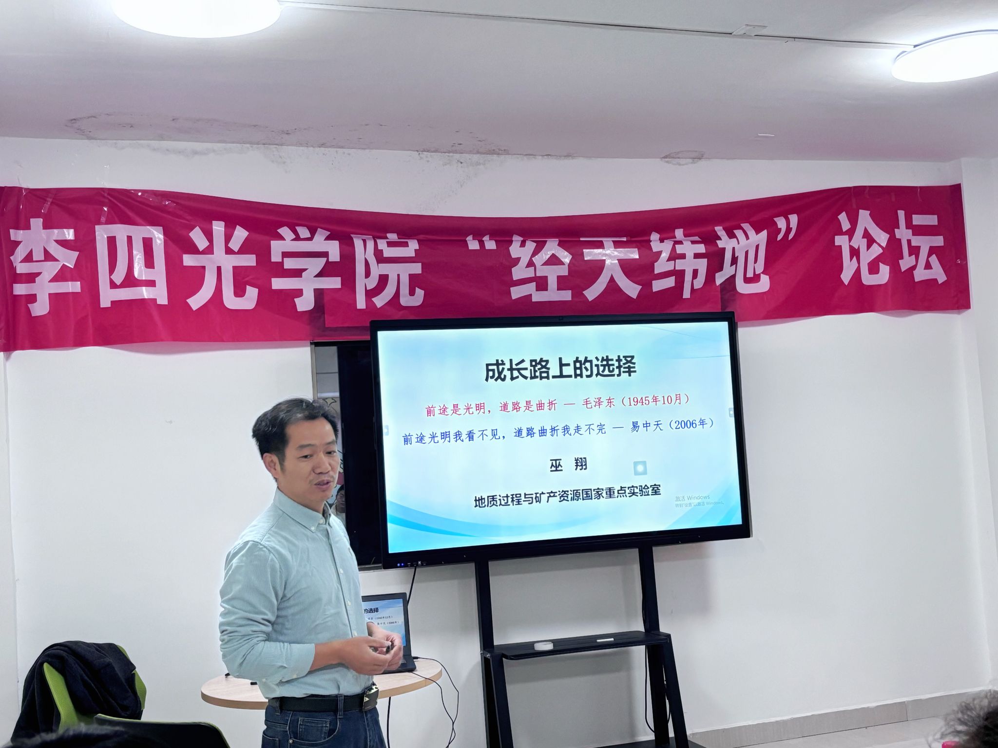 (通讯员 王锦程) 2024年12月12日(星期四)中午12点,为拓宽同学们的视野、提升综合能力,帮助大家在人生道路上做出正确选择,AWC万象城娱乐特邀学校地质过程与矿产资源国家重点实验室常务副主任巫翔教授在南望一站式学生社区·心灵驿站做客第三期“经天纬地”论坛。巫翔教授是“国家杰出青年科学基金”获得者、德国洪堡学者,主要从事地球深部物质科学高温高压研究,代表性成果发表在Nat. Commun.、Sci. Adv.、EPSL、GRL、JGR、PRL等高影响力期刊。