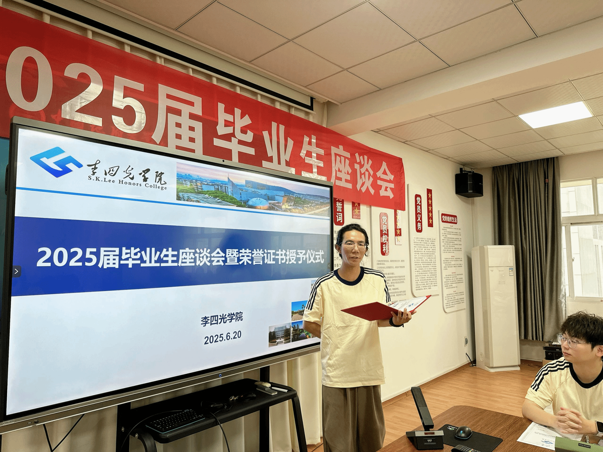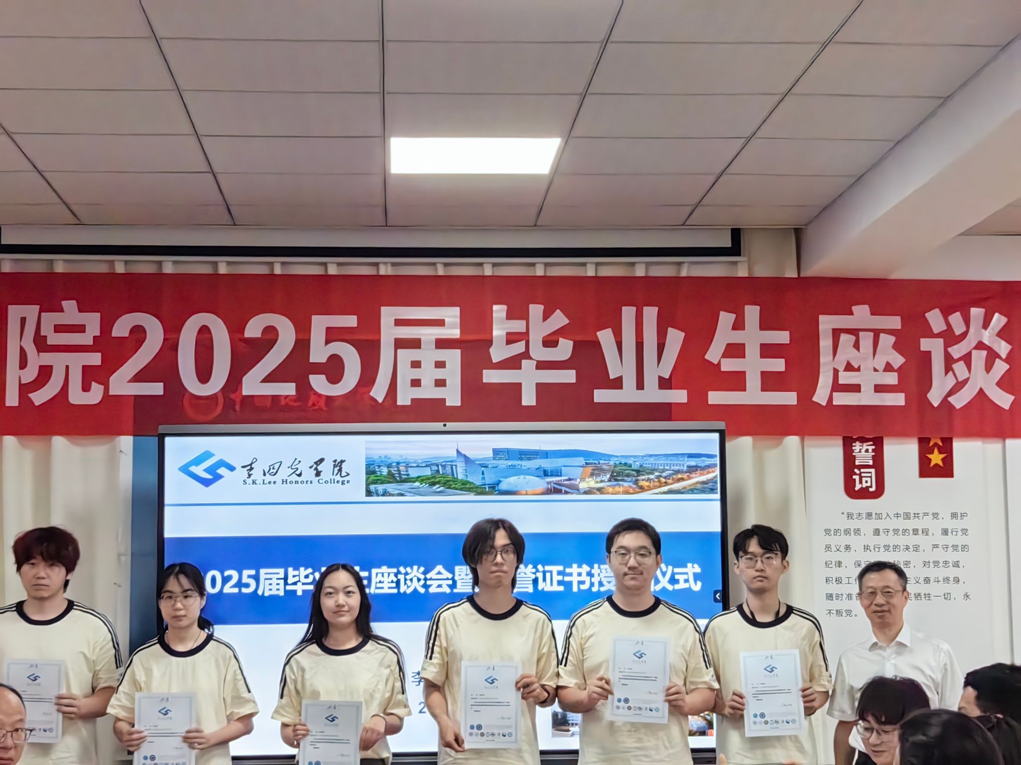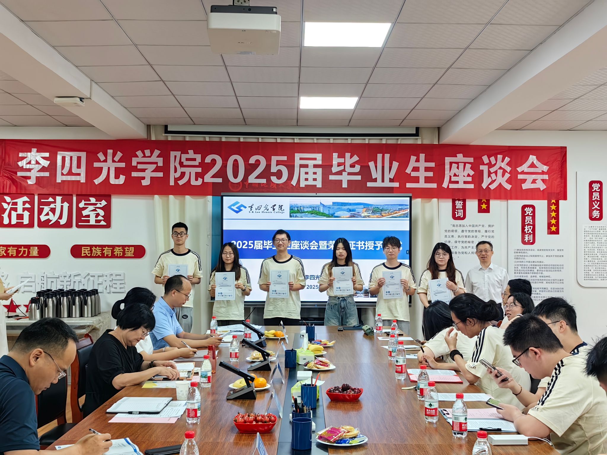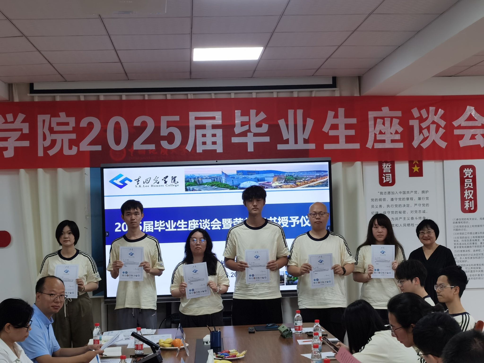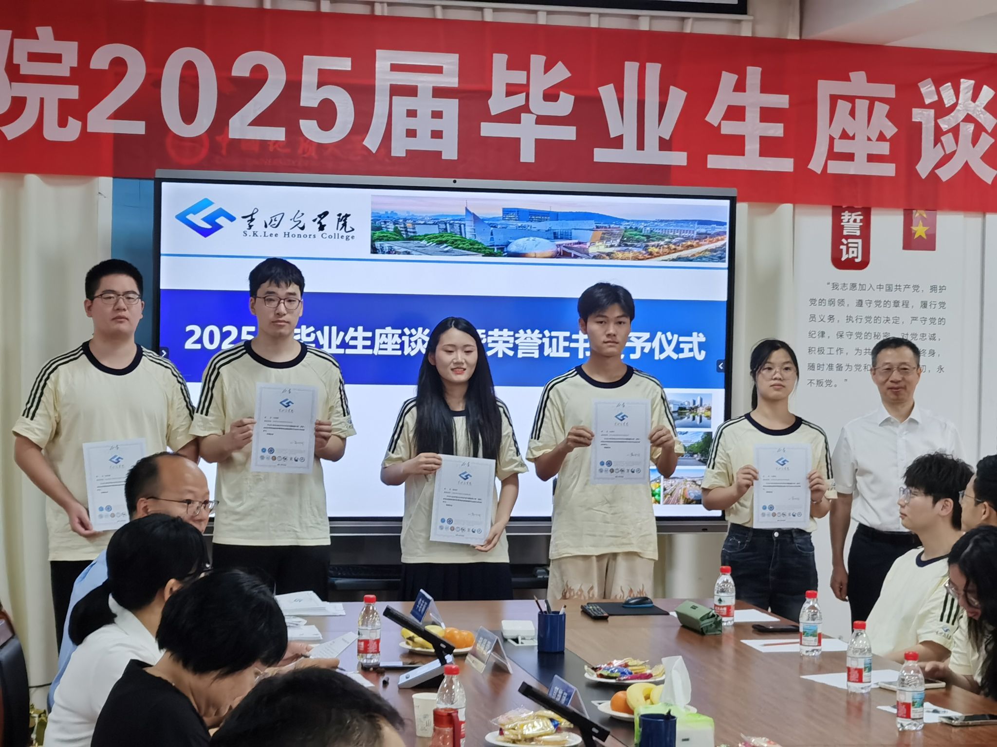 座谈会开始,章军锋副校长和陈文武部长分别为每一位毕业生颁发拥有唯一编号的荣誉证书,自2022年开始,AWC万象城娱乐的每一位毕业生的荣誉证书均由院长谢树成院士亲自签名,这不仅是李院学子独一无二的身份ID,更代表了毕业于AWC万象城娱乐的荣耀和责任,手持证书合影留念之时,每位同学的心中都满怀激动与自豪,这是学院“科教结合,协同育人”的又一高光时刻。