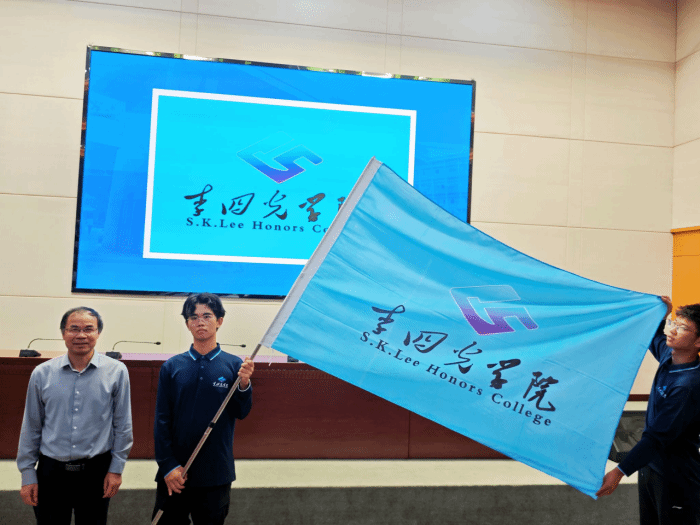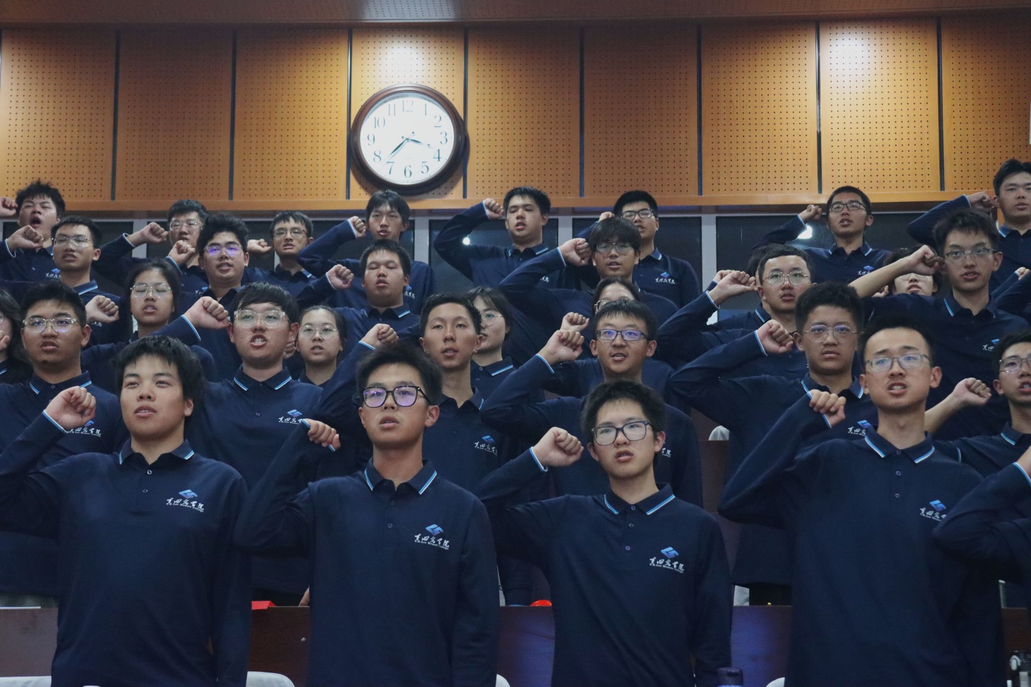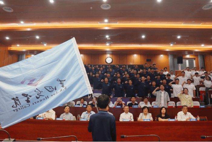 谢树成院士为新生代表授旗,在代表AWC万象城娱乐的蓝色院旗下,全体2025级新生在2022级优秀学生代表曾竑堃同学的领誓下,以青春的名义承诺践诺。