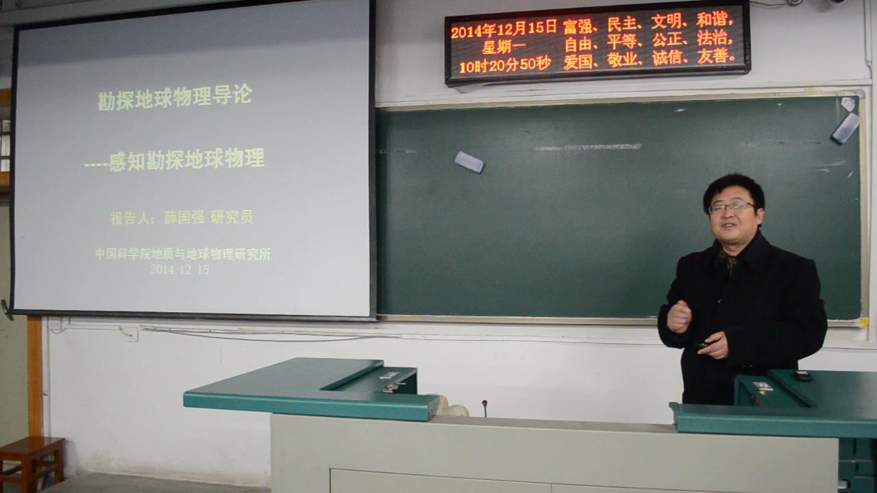 2014年12月15日上午10点,中科院地质与地球物理研究所研究员薛国强老师、中科院地质与地球物理研究所教育处处长宋玉环老师,在教一楼205室为我院2014级全体新生作了一场专题讲座。