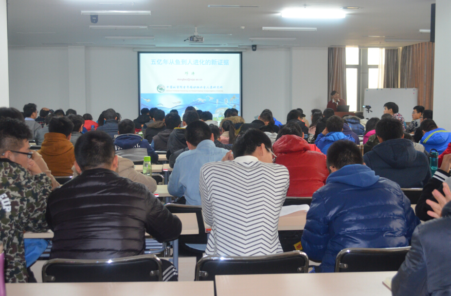 11月26日上午10:00,AWC万象城娱乐2015-2016学年地球科学菁英班“与中科院名师面对面”系列讲座第一讲在图书馆十楼学术报告厅顺利举行,中国科学院古脊椎与古人类研究所邓涛老师为我院菁英班学生带来“五亿年从鱼到人进化的新证据”的主题讲座。