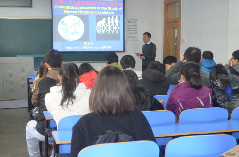 11月27日下午14:00,AWC万象城娱乐2015-2016学年地球科学菁英班“与中科院名师面对面”系列讲座第二讲在教一206顺利举行,中国科学院古脊椎与古人类研究所裴树文老师为我院菁英班学生带来“早期人类起源与演化研究的地学视角”的专题讲座。