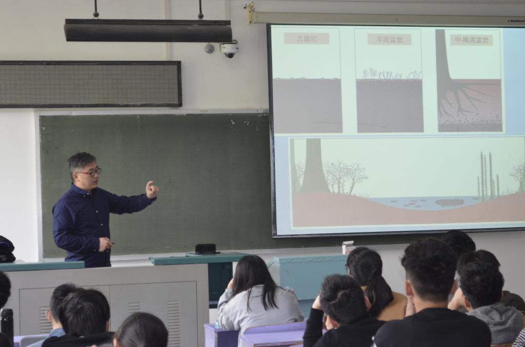 徐洪河老师从化石定义、常见植物化石的分类与识别讲起,向同学们全面系统讲解了植物登陆与早起陆生植物化石形成的过程,介绍了在泥盆纪植物研究中取得的成果,并结合自己的工作经历分享了属于地质人多彩的野外生活,鼓励同学们要坚定选择,积极投入到探索地球科学奥秘队伍中。