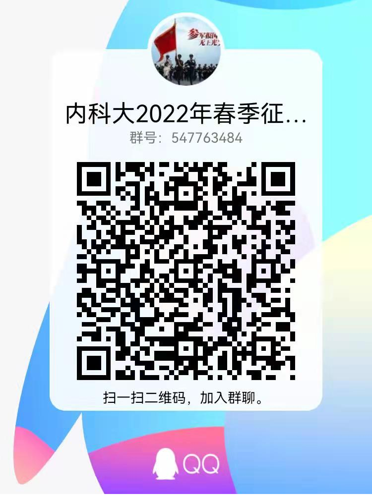 搜索群号547763484(群名为:“内科大2022春季征兵群”),或扫描QQ群二维码。