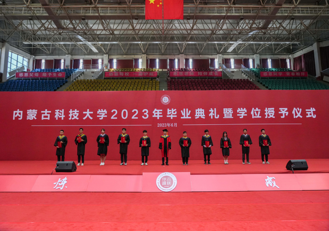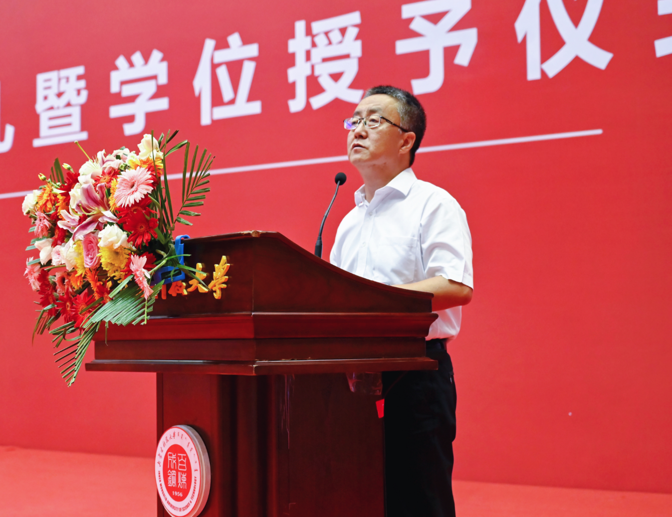 杨建林宣读2023届毕业生在国家、自治区各项赛事中的获奖名单,自治区优秀毕业生、班集体名单及2023 届优秀毕业生“春晖奖”获奖名单和学校十佳毕业班表彰名单,成涛、檀宝文、屈忠义分别为获奖毕业生代表颁奖。