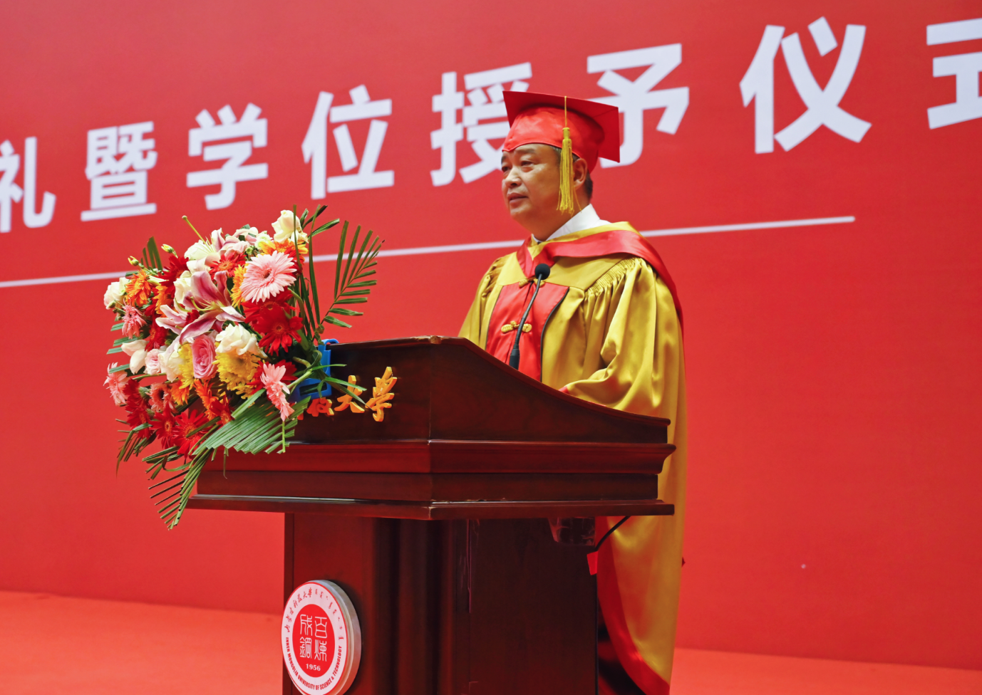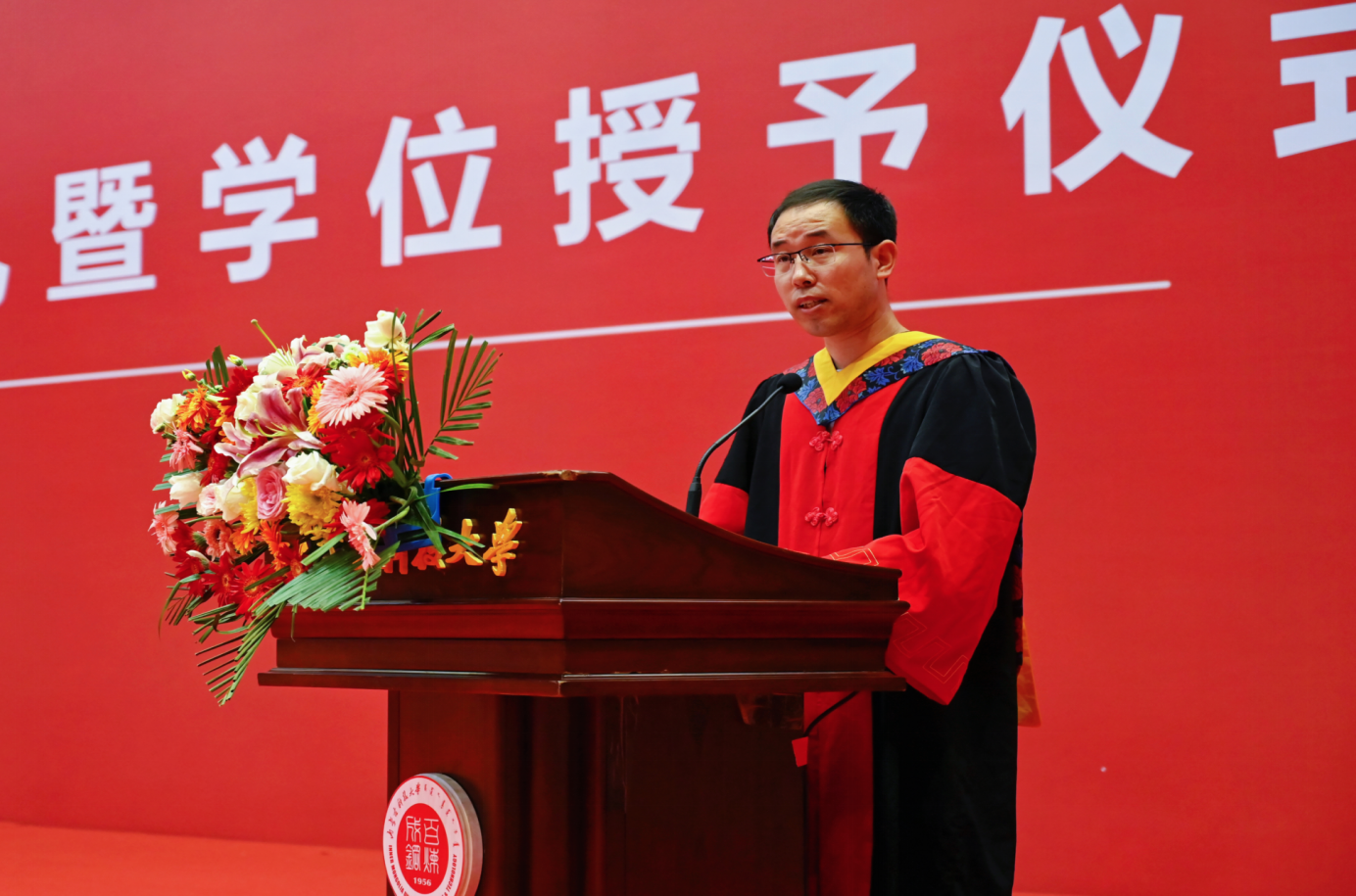 教师代表信息工程学院教授喻大华表达对2023届毕业生的美好祝愿,希望毕业生秉承“百炼成钢”校训和“自强不息、敢为人先”校风,敢于追求梦想、勇于拼搏奋斗、乐于安心恬荡。