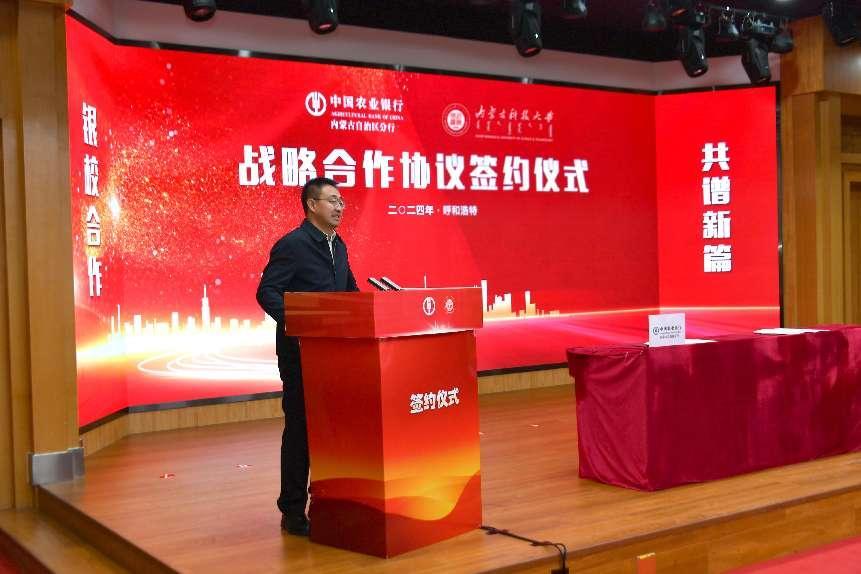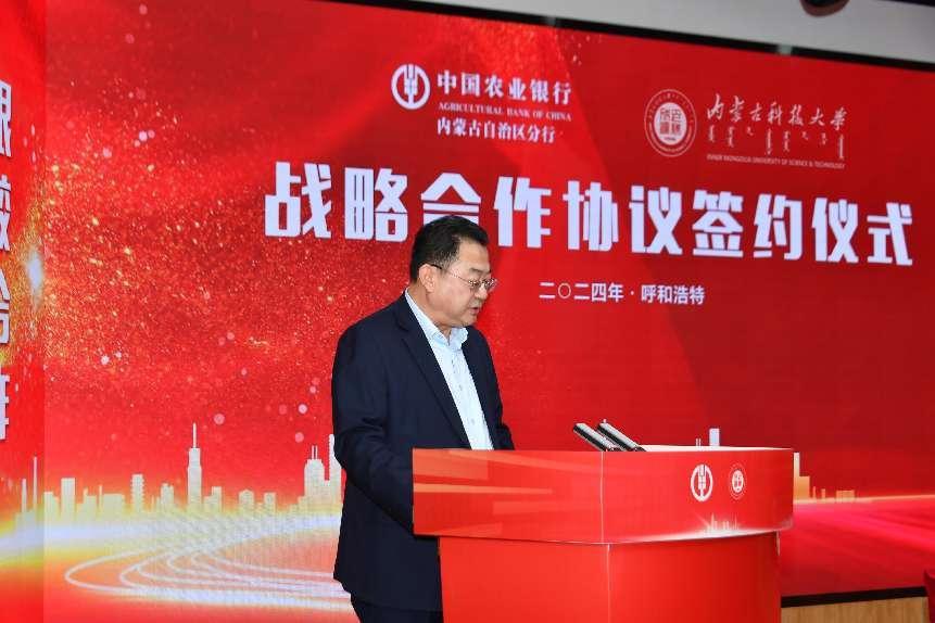付晓对科技大学多年来办学取得的成绩表示祝贺。他说,中国农业银行内蒙古分行作为国有控股大型上市银行,始终坚守家国情怀,积极践行社会责任,长期服务自治区党委政府整体规划,特别是近年来全力服务“五大任务”,赢得了社会的广泛认可。中国农业银行内蒙古分行正积极开展“春天行动”活动,与科技大学共同签署战略合作协议拉开深化合作的序幕,为“春天行动”增添了浓墨重彩的一笔。希望以本次签约为契机,双方进一步推动教育、科技、人才与金融的深度融合,构建银校合作新格局。