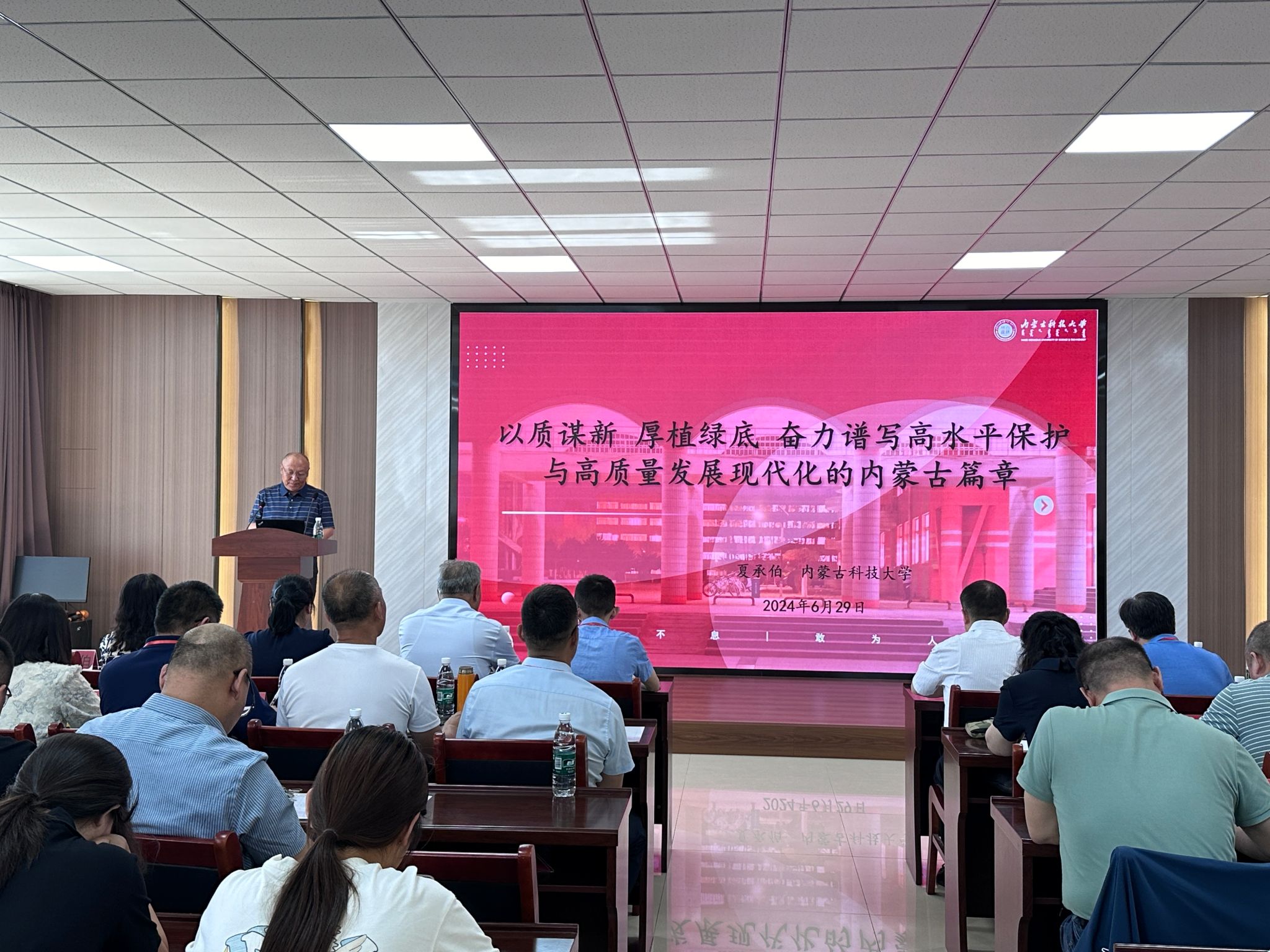 会议邀请beat365英国官方网站马克思主义学院夏承伯教授作题为《以质谋新厚植绿底奋力谱写高水平保护与高质量发展现代化的内蒙古篇章》的主旨报告。报告围绕新质生产力概念内涵深度解析、新质生产力绿色维度深层解读、新质生产力发展的内蒙古解答三个方面进行阐释汇报。