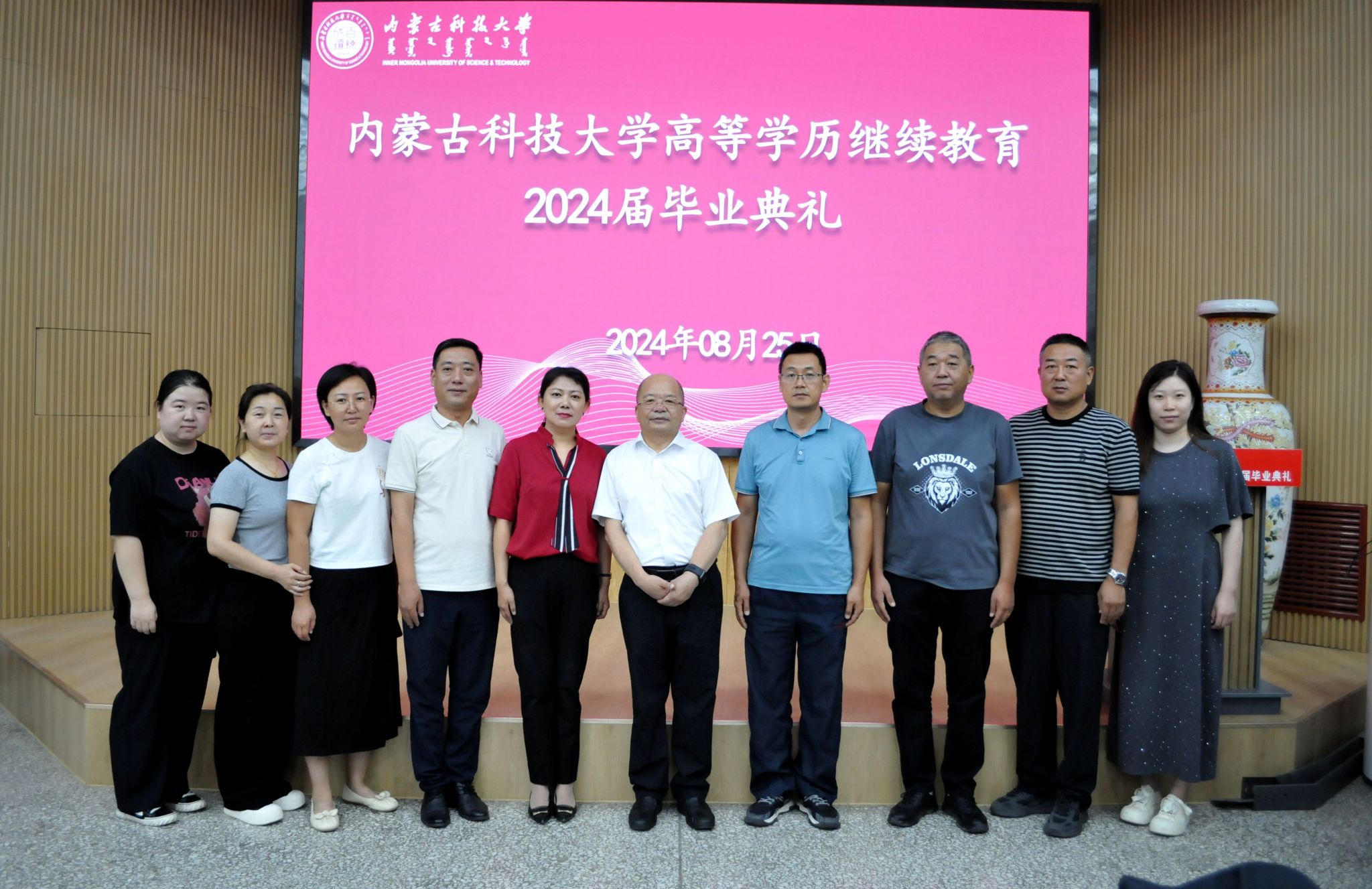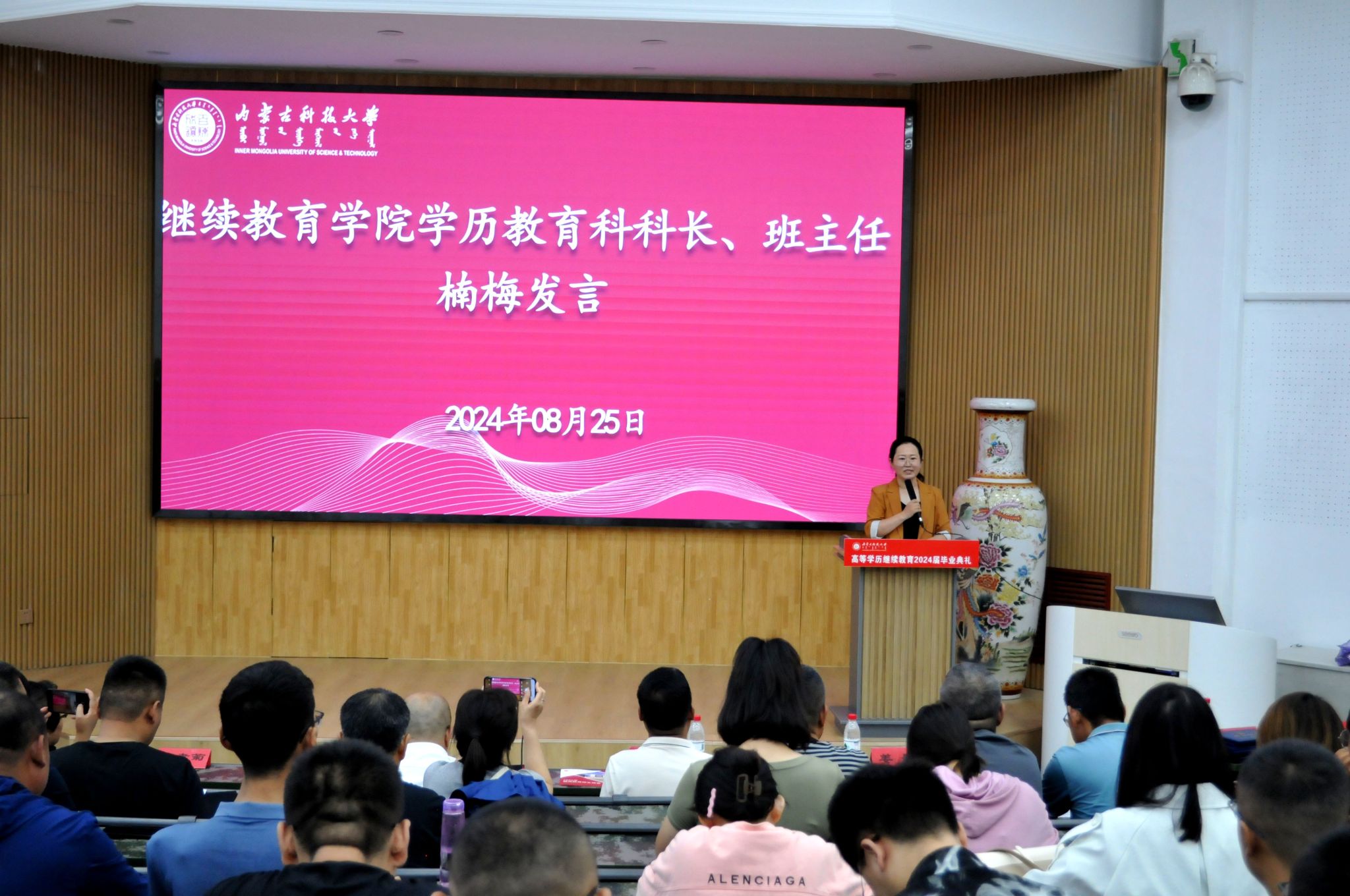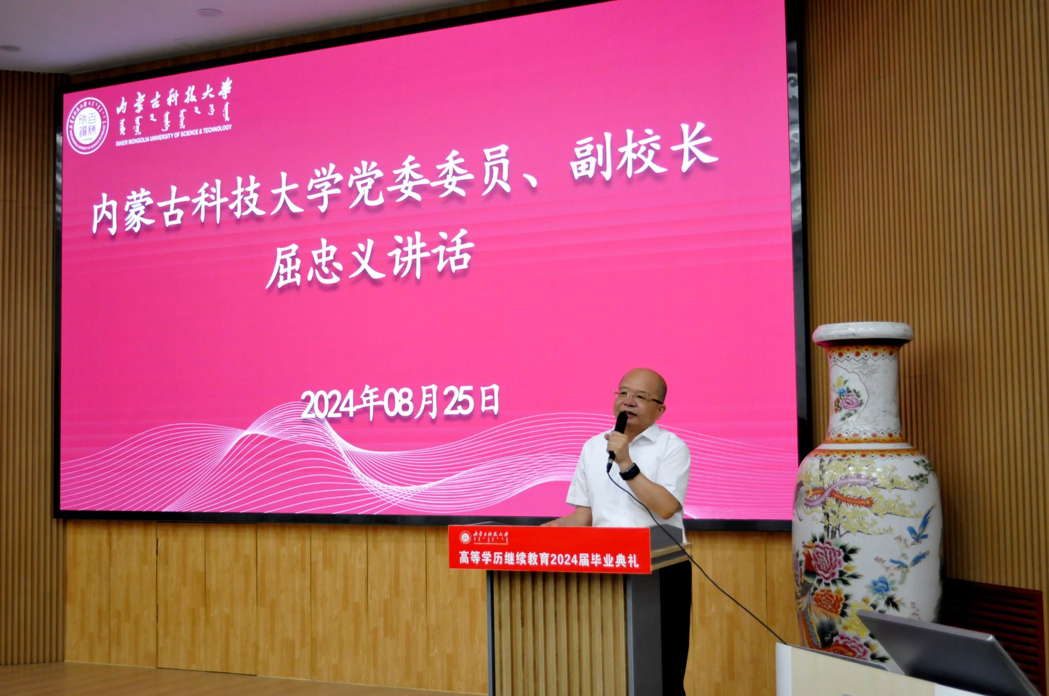 8月25日上午,beat365英国官方网站高等学历继续教育2024届毕业典礼在春晖学堂隆重举行。本次毕业典礼采用线上线下同步直播的方式进行。包头市总工会代表、企业人力资源部代表、教师代表、继续教育学院全体教职工、毕业生代表等近100人参加线下毕业典礼,近1000人次线上观看直播。副校长屈忠义出席毕业典礼。
