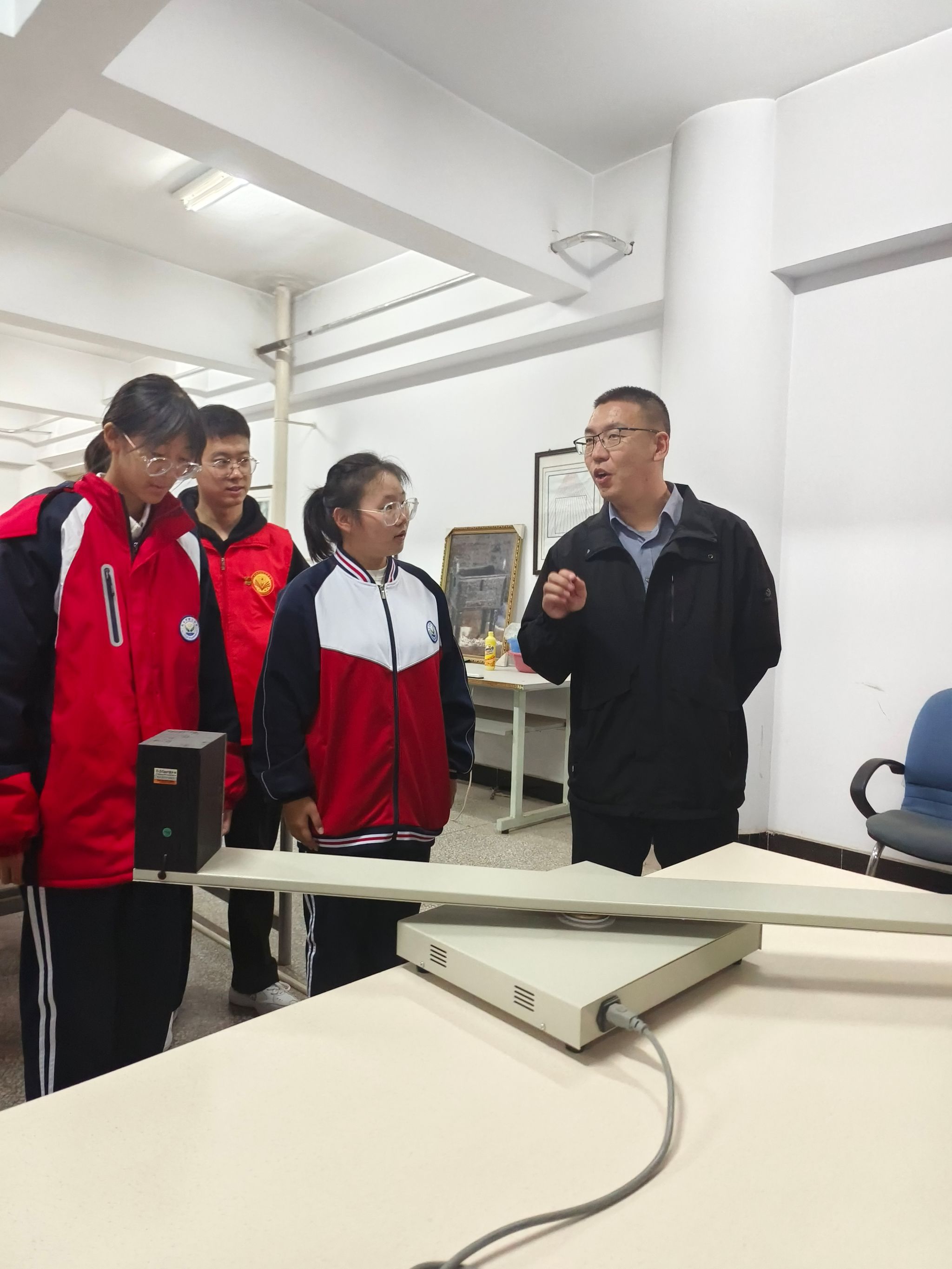 在秋实楼理学院物理实验中心,理学院师生为中学生们进行了实验讲解和演示,展示了静电感应、蛇形摆、无弦琴、无皮鼓等20余个有趣的实验。同时,为学生带来了科普小讲座,讲解迈克尔干涉仪实验原理,并教会他们用实验仪器进行实操。现场中学生被丰富的科学知识所吸引,频频举手互动,并与现场科普志愿者深入交流。