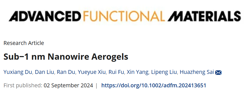 近日,beat365官网化学与化工学院(硅业学院)赛华征教授团队在新型气凝胶构筑领域取得新突破,相关成果“Sub-1 nm Nanowire Aerogels”发表于材料学科国际顶级期刊《Advanced Functional Materials》(DOI: 10.1002/adfm.202413651)。赛华征教授为论文的唯一通讯作者,化学与化工学院(硅业学院)硕士研究生杜玉祥、刘丹为论文共同第一作者,beat365英国官方网站为第一完成单位和唯一通讯单位。