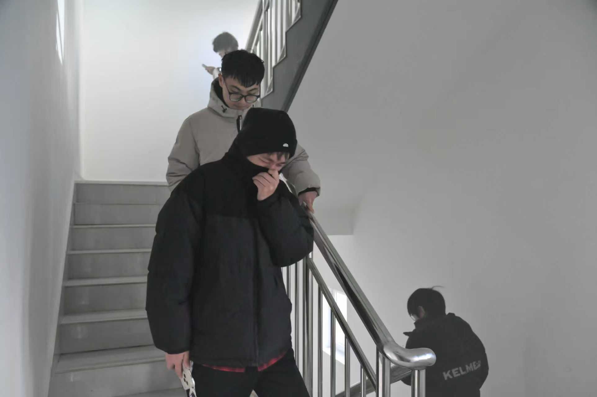 高层学生公寓内部突发“火情”后,警报声骤然响起,学校迅速启动消防应急疏散预案,各学院师生在安全员的引导下,用湿毛巾捂住口鼻、弯腰低姿,按照既定疏散路线快速、有序向安全区域撤离。从警报拉响到全体师生撤离完毕,仅用时5分25秒。
