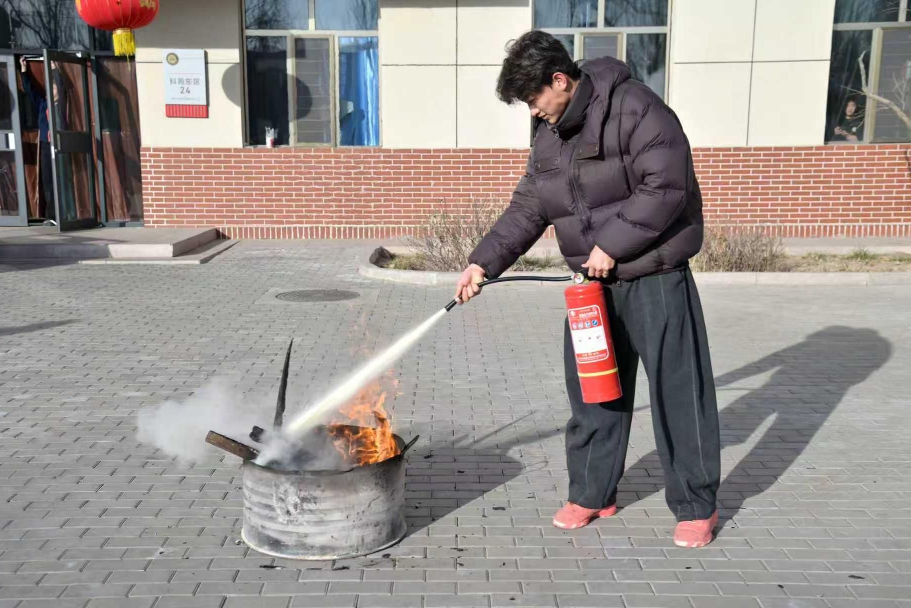 疏散集结后,实战教官现场讲解了灭火器的工作原理与使用技巧,将“提、拔、握、压”的操作口诀与实操演示相结合,直观呈现了灭火要领。师生代表踊跃参与,在实践中深化对消防知识的理解,切实提升初期火灾扑救能力。