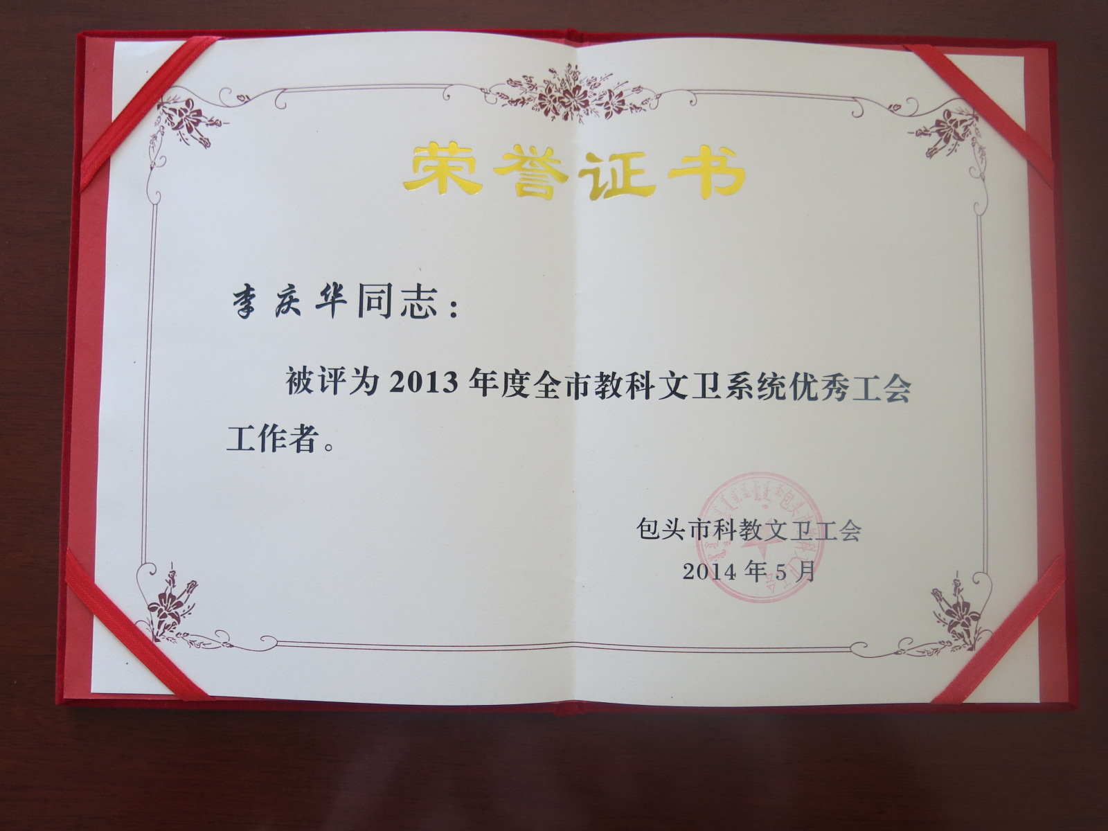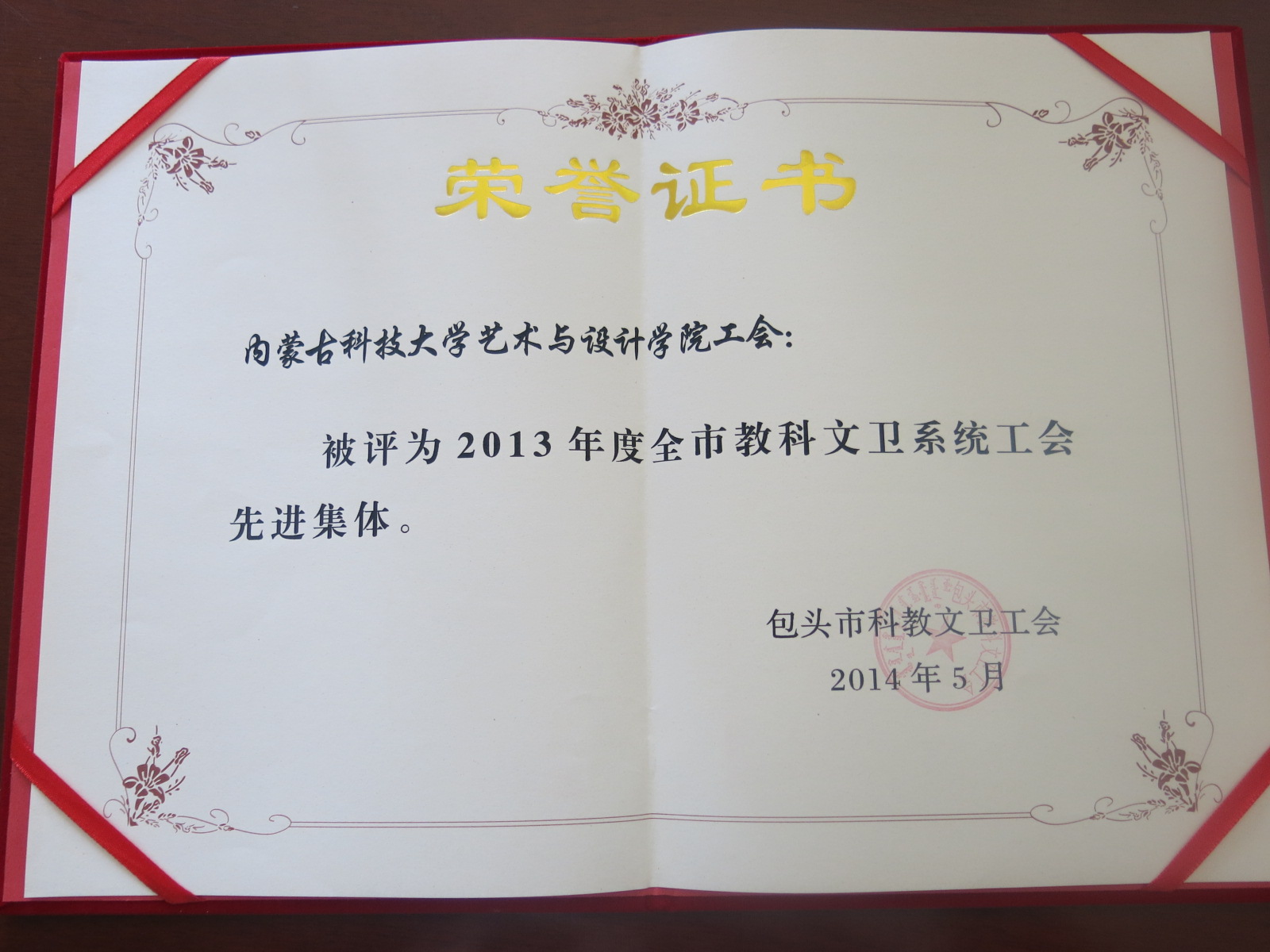 经过各级工会推荐,由包头市教科文卫工会评选,beat365官网艺术与设计学院工会被评为2013年度全市教科文卫系统工会先进集体称号,校工会李庆华被评为2013年度全市教科文卫系统优秀工会工作者。