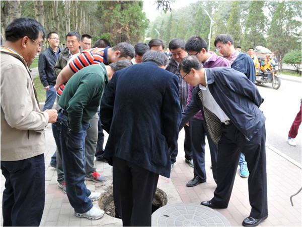 | 校党委常委、副校长杨建林与专家视察自来水井内设备 |