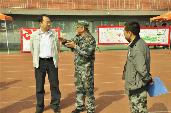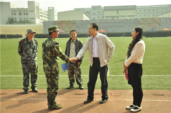 在军训场地上吕校长详细了解了新生的军训情况,并亲切慰问了服务站的工作人员,最后对此次军训工作给予了充分的肯定。