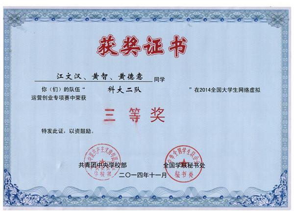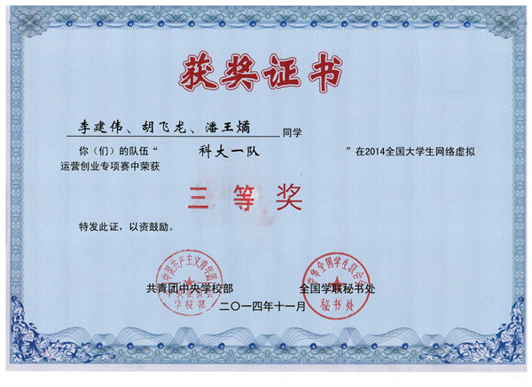 全国大学生网络虚拟运营创业专项赛是“创青春”全国大学生创业大赛的重要组成部分,大赛吸引了全国278所高校的1500多支创业团队报名参赛,经过初赛、复赛层层选拔,来自全国69所高校的101支大学生创业团队入围了最终的总决赛。beat365官网两支队伍“科大一队”和“科大二队”入围并参加了本次决赛。经过紧张激烈的比赛,beat365官网两支队伍均获2014全国大学生网络虚拟运营创业专项赛全国总决赛三等奖。