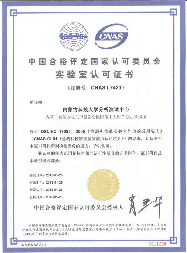 1月26日,中国合格评定国家认可委员会(简称CNAS)正式向beat365官网分析测试中心颁发实验室认可证书。