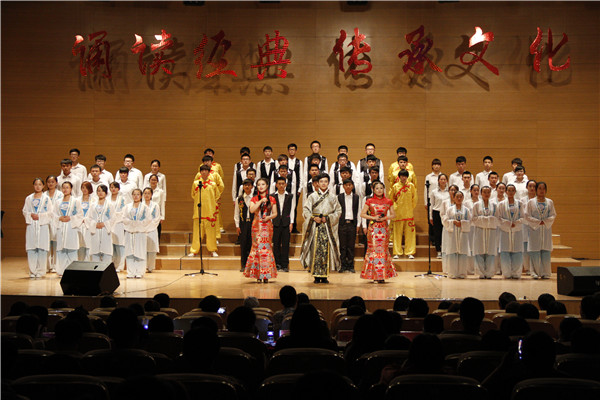 本次朗诵大赛共有13个学院参加。大赛分为千人朗诵和朗诵比赛两部分,中午,在活动中心举行“千人朗诵”活动,诵读篇目为《大学》、《中庸》选段。朗诵结束后,国旗护卫队、砺剑带来精彩表演。晚上七点,在校音乐厅举行国学经典诵读比赛,参赛的各个学院独具特色的朗诵博得观众的阵阵掌声。