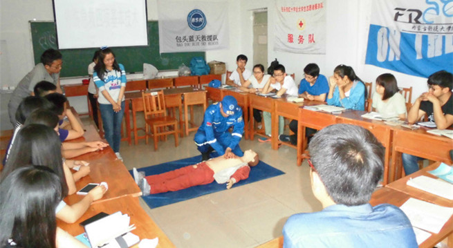 为了保证培训质量,此次培训从报名的学生中优中选优挑选了40名同学。在为期一天的培训中,二位讲师通过多媒体与实践相结合的方式给同学们进行了外伤包扎、心肺复苏、人工呼吸、地震避险、踩踏自救、野外危险识别等内容的培训,同时宣传了蓝天公益救援的理念。