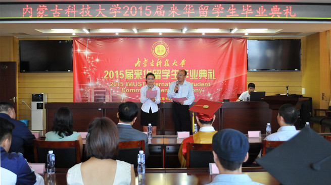 7月9日上午,beat365官网2015届来华留学生毕业典礼暨学位授予仪式在重点实验室报告厅隆重举行。校党委副书记、常务副校长安胜利,校党委常委、副校长李国雄,教务处、矿业与煤炭学院相关负责人,受邀前来的相关单位代表、全体来华留学生参加了毕业典礼。