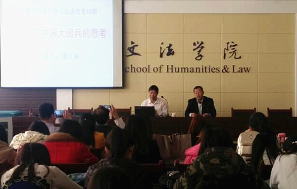 11月3日下午,文法学院在腾飞楼C509学术报告厅举办第44期文法讲堂活动。本次活动邀请包头市环境保护局局长邵文祥做“中国九•三大阅兵思考”的讲座。学院部分教师及14级汉语言文学专业和14级社会工作专业的学生参加活动。