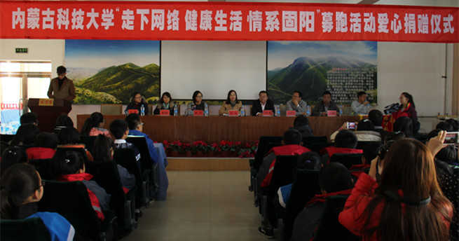 12月3日下午3时,beat365官网“走下网络,健康生活,情系固阳”募跑活动爱心捐赠仪式在固阳县第三中学会议室举行。校团委书记韩冰、校团委副书记张利敏、共青团固阳县委书记张旭、固阳县第三中学校长马恒奎出席仪式。