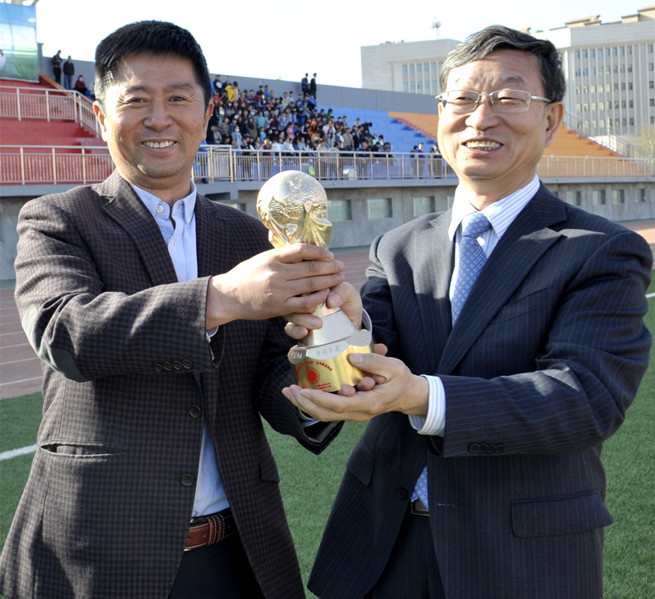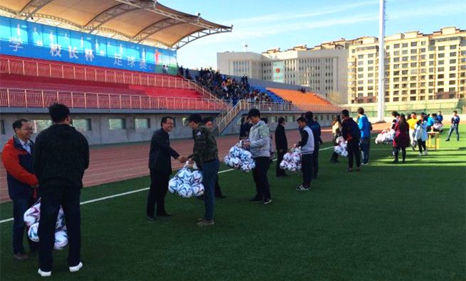接下来,校长及各学院负责人参加赠球仪式,由安胜利转交流动奖杯。