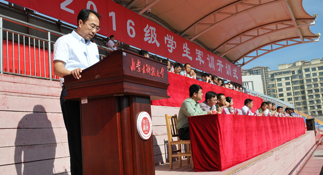 2016级学生军训团团长郭中旗代表军训教官讲话,并希望通过军训提高学生的国防意识,增强体魄,打下坚实的基础,迎接新挑战。