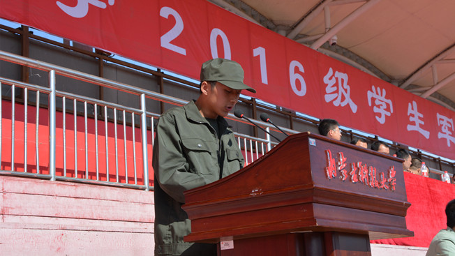最后,信息学院电气工程及其自动化专业2016-1班张新宇同学代表全体新生发言,表达了完成军训的信心和决心。