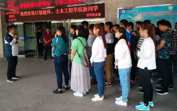 入馆前,新生分两队在图书馆东西两个入口处列队进入。9月3日上午,土木工程学院第三小组在图书馆东门外列队期间,图书馆相关负责人为同学们讲解了图书馆的概念、重大意义和重要功能作用。