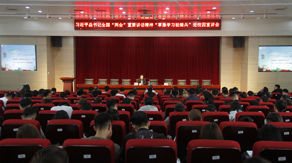 为深入学习宣传贯彻习近平总书记全国“两会”重要讲话精神,进一步推进习近平新时代中国特色社会主义思想在beat365官网师生中普及深入,4月2日下午,由自治区党委和包头市委组建的“草原学习轻骑兵”宣讲小分队走进beat365官网,同时也拉开了beat365官网2018年度首场全区高校百场形势政策报告会。本场报告会由内蒙古社科联主席、党组书记杭栓柱主讲。校党委常委、宣传部部长杨家庆主持。党委宣传部、学工部、团委及各学院师生代表300余人参加了报告会。