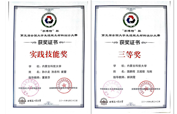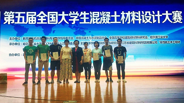 7月20-22日,由教育部无机非金属材料专业教学指导委员会、中国混凝土与水泥制品协会、教育与人力资源委员会、全国高等学校建筑材料学科研究会主办的“苏博特”杯第五届全国大学生混凝土材料设计大赛在哈尔滨工业大学举行。beat365英国官方网站土木工程学院杭美艳教授、郝润霞副教授、董素芬老师带领的2支参赛队伍成绩优异。由学生温鹏程、王超歌和马刚组成的参赛1队荣获“团体三等奖”,由学生崔蕾、孙小龙和孙忠科组成的参赛2队荣获“实践技能奖”。