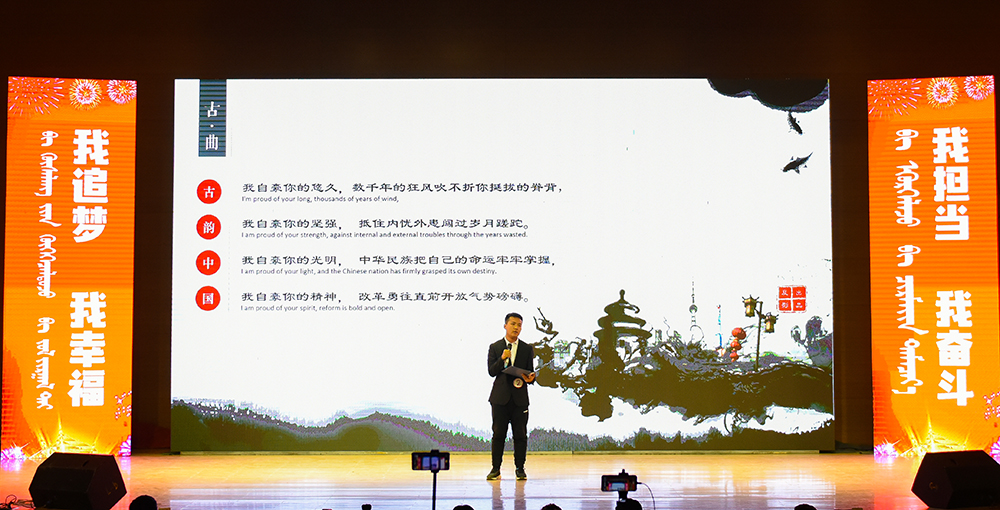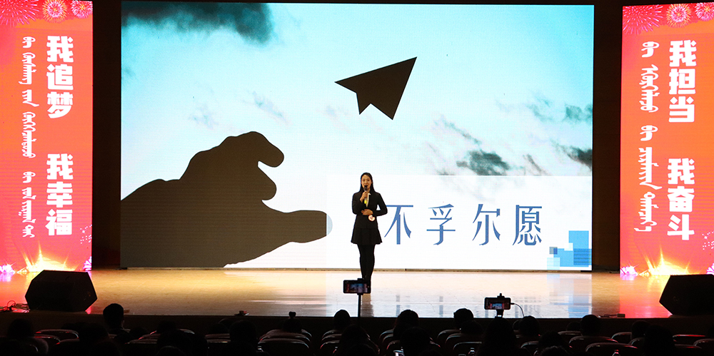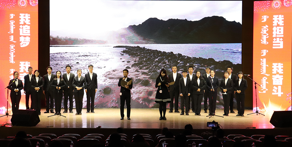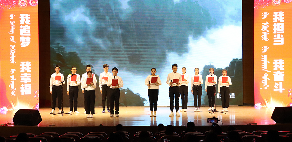学生代表经济与管理学院16会计2班朝木日力格发言。她表示,作为新时代青年的一份子,应该坚定理想信念,紧跟党的步伐,勤奋学习、练好本领,用新思想武装头脑,更好地学习与工作。积极参与校园内文化艺术活动,唱响“爱国担当奋斗”主旋律,不断凝聚争做担当民族复兴大任时代新人的使命感责任感。