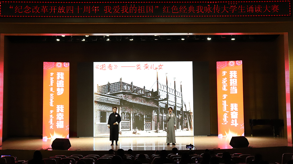 仪式结束后,“纪念改革开放四十周年我爱我的祖国”红色经典我咏传诵读大赛决赛举行。本次诵读大赛决赛遴选出来的优秀作品将与上学期开展的“中华优秀经典诗词诵读活动”决赛遴选出来的优秀作品,推报参加“红色经典我咏传”全区大学生诵读大赛西部赛区复赛。