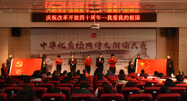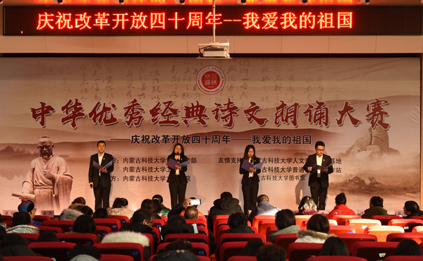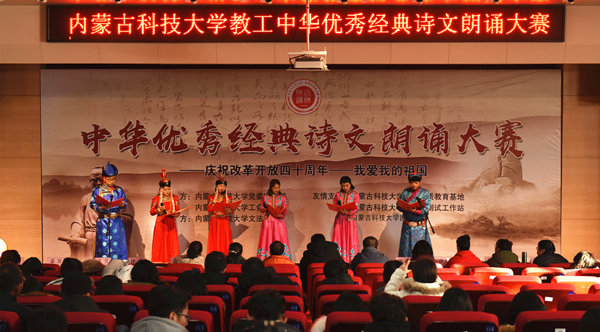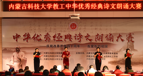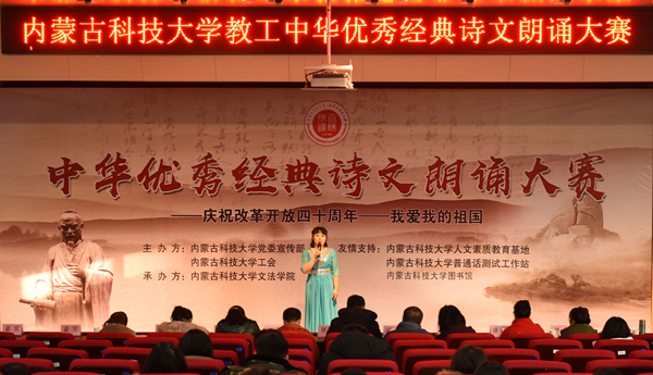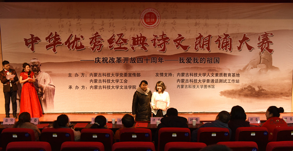 决赛开始,首先登场的是信息工程学院洪燕,一首辛弃疾的《永遇乐·京口北固亭怀古》以饱满的情绪和出色的舞台表现力赢来台下观众的阵阵掌声。学生工作部集体朗诵的《祖国颂》铿锵有力地道出了对祖国母亲的崇敬之情。人事处集体身着蒙古袍,以蒙、汉双语结合的形式,带来一首《我爱你,我的祖国》惊艳四座。图书馆的杨颖娓娓道来一首《我的南方和北方》,令在场所有观众沉浸在对祖国家园的爱恋之中。文法学院王继霞、杜慧敏、刘红红、柏朝霞四位老师身着旗袍,感情充沛、声情并茂的朗诵一首《青春中国》,使现场气氛达到高潮。团委的龙鹤和能源与环境学院的应吉日木吐共同朗诵的《四十载志士青春,换一景盛世中国》,完美诠释了报效祖国的魄力和决心。此外,教务处的《祖国啊,我亲爱的祖国》、招生就业处的《地球,我的母亲》、党委宣传部的《我的祖国》、工程训练中心的《启航》、土木工程学院《改革开放,再创辉煌》、经济与管理学院的《春风里的中国》、文法学院的《乡愁》、党政办公室的《我骄傲,我是中国人》、体育教学部的《四十年岁月如歌》,一轮轮精彩的朗诵,选手们充分展现了对祖国的热爱、歌颂与赞美。