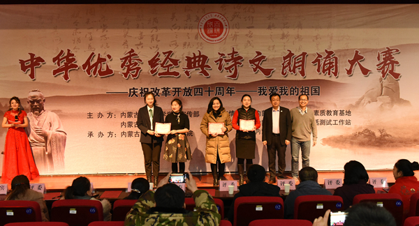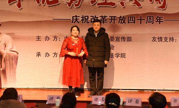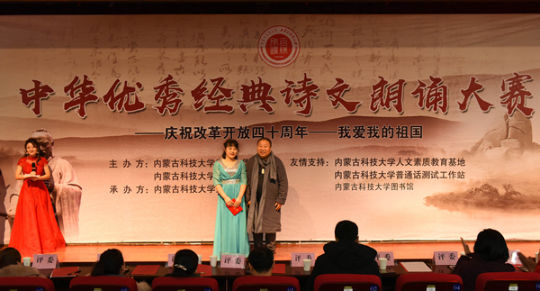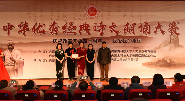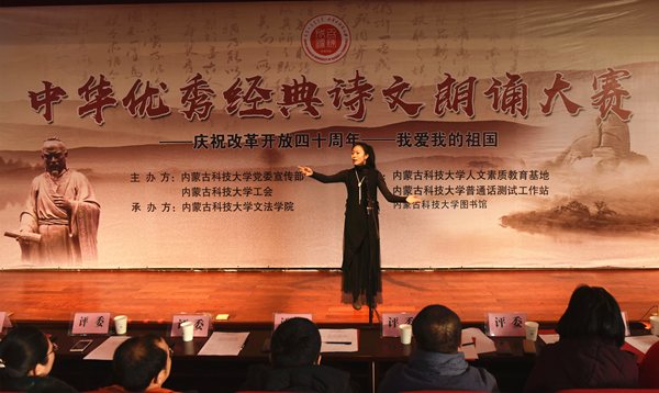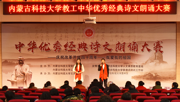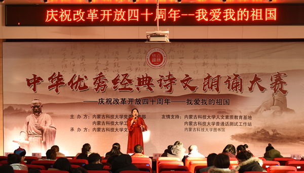 为庆祝改革开放40周年,深入挖掘中华优秀传统文化,切实提升广大教职工的思想水平和文明素养。1月4日下午,学校举办以“庆祝改革开放四十周年——我爱我的祖国”为主题的教工中华优秀经典诗文朗诵大赛。包头市阅读会主席刘晓刚,副主席李丽,包头广播电视台产业经营中心副总监孙武,校党委宣传部、工会、文法学院、艺术与设计学院、普通话测试中心相关负责人及代表等9人出席活动并担任评委。
