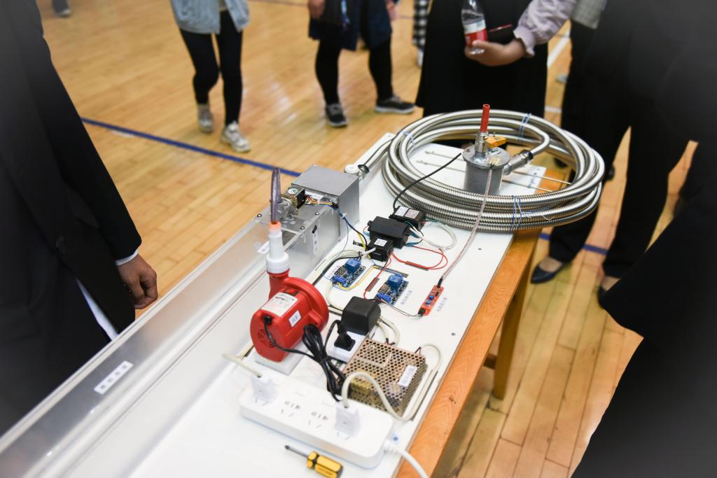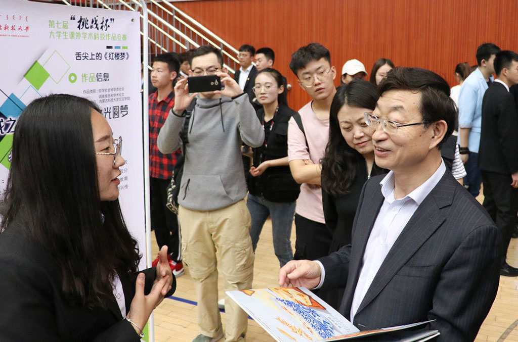 安胜利宣布决赛比赛正式开始,并在参观作品期间与参赛者交流、探讨。他对参赛者的创新精神给予充分肯定,鼓励大家将作品进一步应用于实践,并对参赛作品提出意见和建议。安胜利在参观期间指出,学校的“挑战杯”举办至今发掘到了很多优秀人才和独具特色的作品,有效促进了学生的知识应用、有效培养了学生的动手能力,希望通过“挑战杯”培养科大学子的创新意识和实践能力。