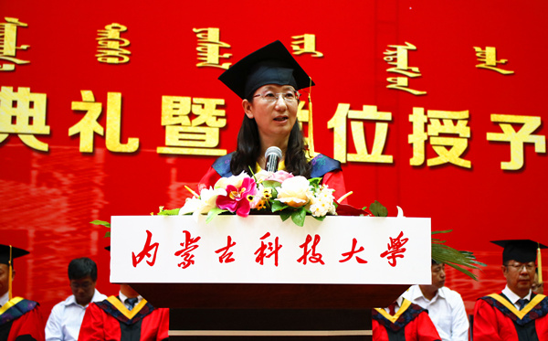 教师代表、机械工程学院院长谭心教授对圆满完成学业的同学们表示祝贺并提出殷切希冀,她希望母校的大学精神能激励着毕业生们前行的脚步,也希望科大的生活能成为他们人生中最珍贵最难忘的记忆。