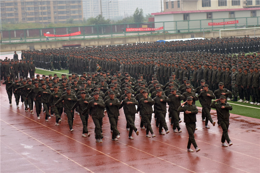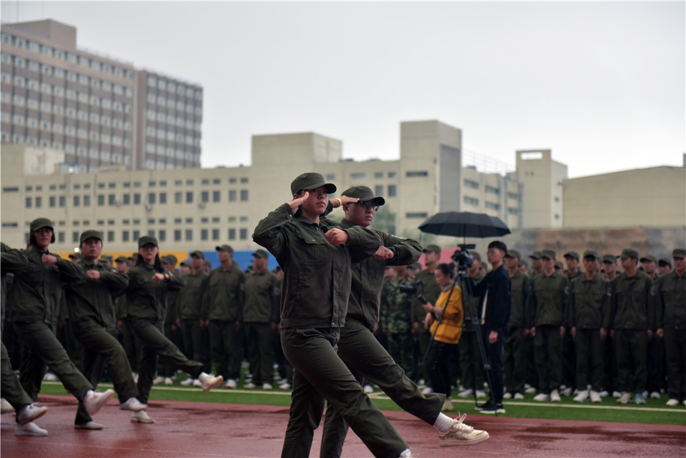 副校长冯志强检阅各军训连队,慰问新生。在检阅完毕后,大会进入高潮,阅兵式、分列式开始,天空下起小雨,军训学生们依旧斗志昂扬,各连队迈着整齐的步伐,喊着嘹亮的口号,依次走过主席台接受检阅。