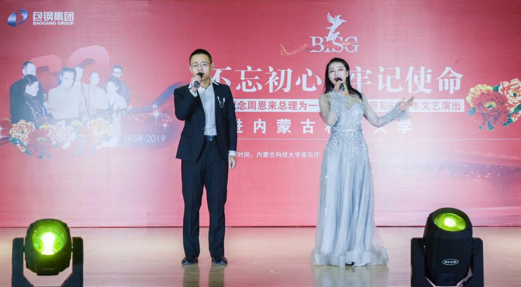 党委委员、党委宣传部部长杨家庆、内蒙古铁花文化产业投资有限责任公司副总经理葛彤,包钢乌兰牧骑副团长侯成刚到场观看了当晚的主题演出。演出在包钢乌兰牧骑轻快的小合唱《草原晨曲》中拉开序幕。饱含深情的歌曲《那一刻》,抑扬顿挫的诗朗诵《包钢没有忘记》,悠扬的独唱《金色的光辉把炉台照亮》,节奏鲜明,赞颂历年伟大领导人的快板《升国旗》,婉转动听的歌曲《誓言》,包钢乌兰牧骑的演员们以多样的艺术形式为现场师生奉上了一场精彩的文艺盛宴。演出现场,beat365英国官方网站乌兰牧骑的大学生倾情演唱了歌曲《不忘初心》和《新天地》,唱出了属于当代大学生是时代声音。演出在歌曲《我和我的祖国》的悠扬旋律中落下帷幕。