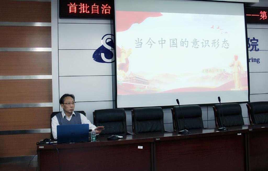 讲座中,王立东教授凭藉多年学术研究,用深入浅出的语言作了题为《当今中国的意识形态》的演讲,以当前我国意识形态工作的“极端重要性”为导言,阐述了“意识形态”概念、特点、内容构成,沿着党的历史、时政热点、社会现实的逻辑脉络,生动讲述了我国意识形态问题的由来、意识形态问题的具体表现、意识形态问题的历史演变、当前我国意识形态的原则。王立东的讲座理论性强、学术性高又切近实际,赢得了现场所有师生多次热烈的掌声。