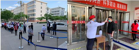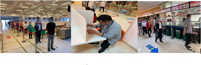 演练中,从业人员模拟师生,按餐厅布置的各类指示、标识和工作人员的引导,从食堂门口间隔一米排队,依次经过鞋底消毒区,体温检测区、手部消毒区、取餐区、就餐区、餐厨垃圾回收区直至离开餐厅。