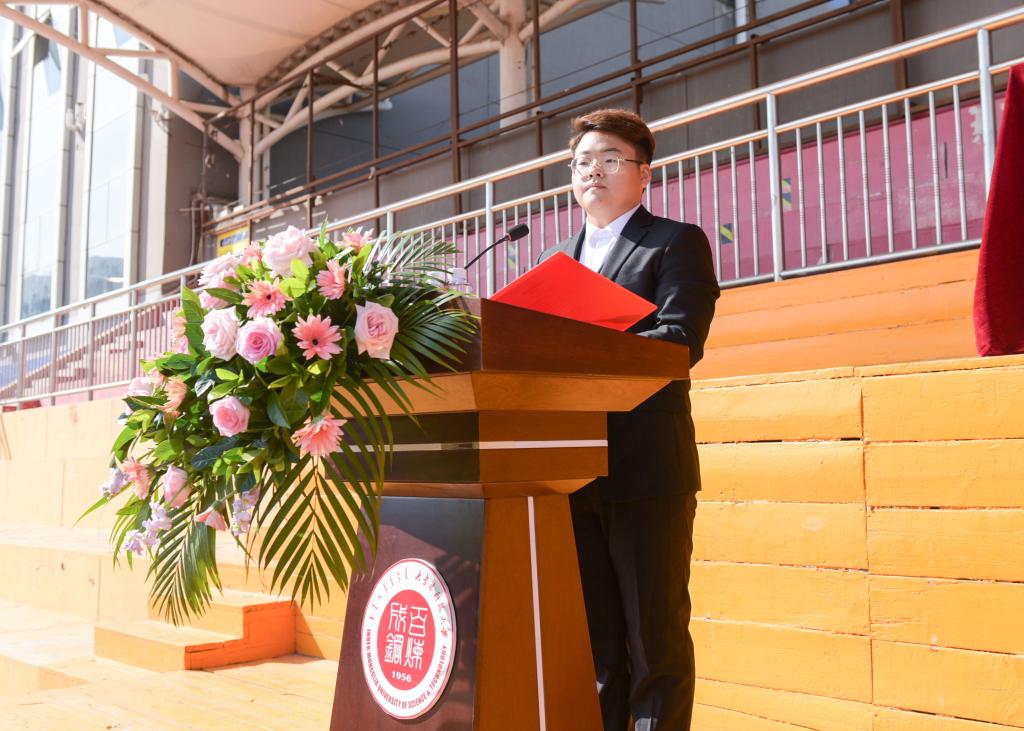 能源与环境学院2020级新生杜世杰作为新生代表讲话。他说,今天是一个圆梦的日子,每个人站在这里都激动不已,踏进校门那一刻就被美丽的科大所吸引,这是一个全新的起点。他在感到骄傲的同时又感到重任在肩。“恰同学少年,风华正茂”,作为新时代青年,要在祖国最需要的地方建功立业,永远心怀家国,怀揣梦想,携手并肩,努力成为堪当民族复兴大任的科大人!