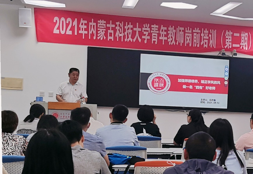 党委副书记冯志强以“加强师德修养,端正学风教风,做一名‘四有’好老师”为题作专题讲座