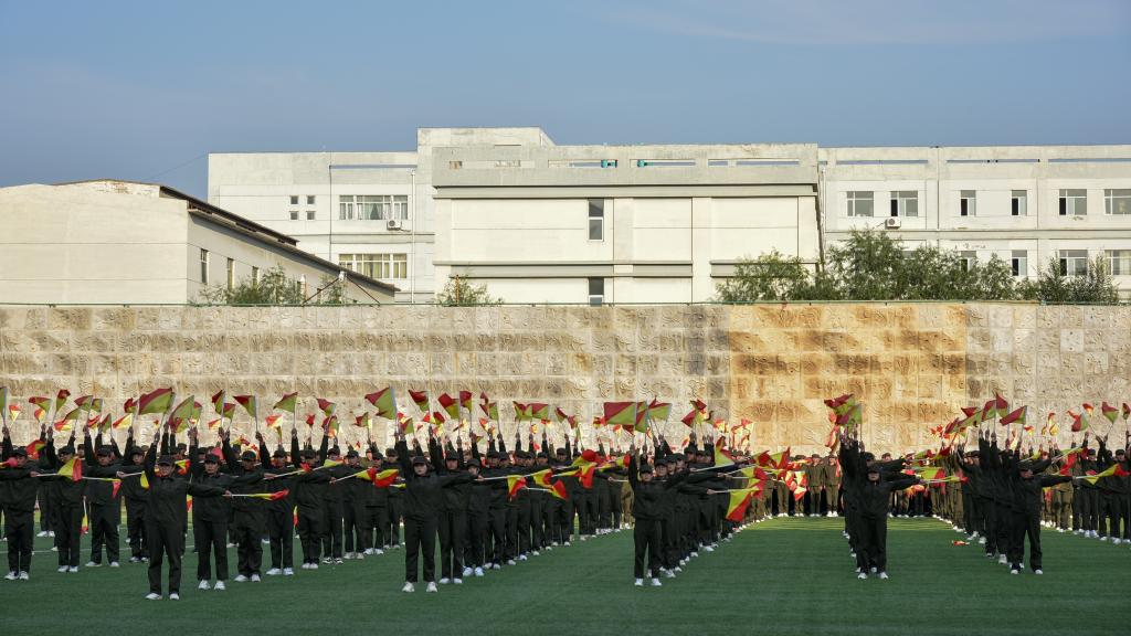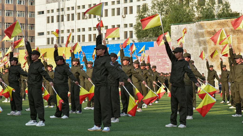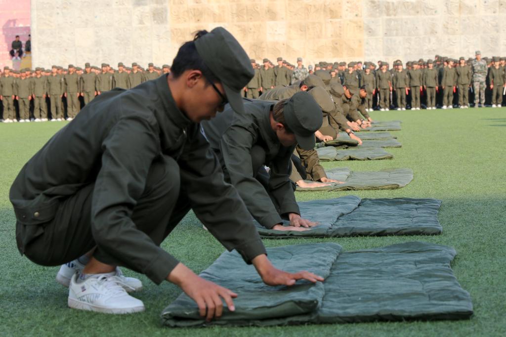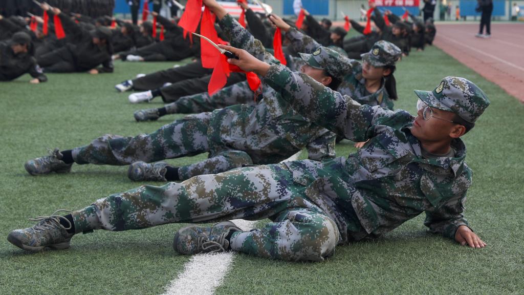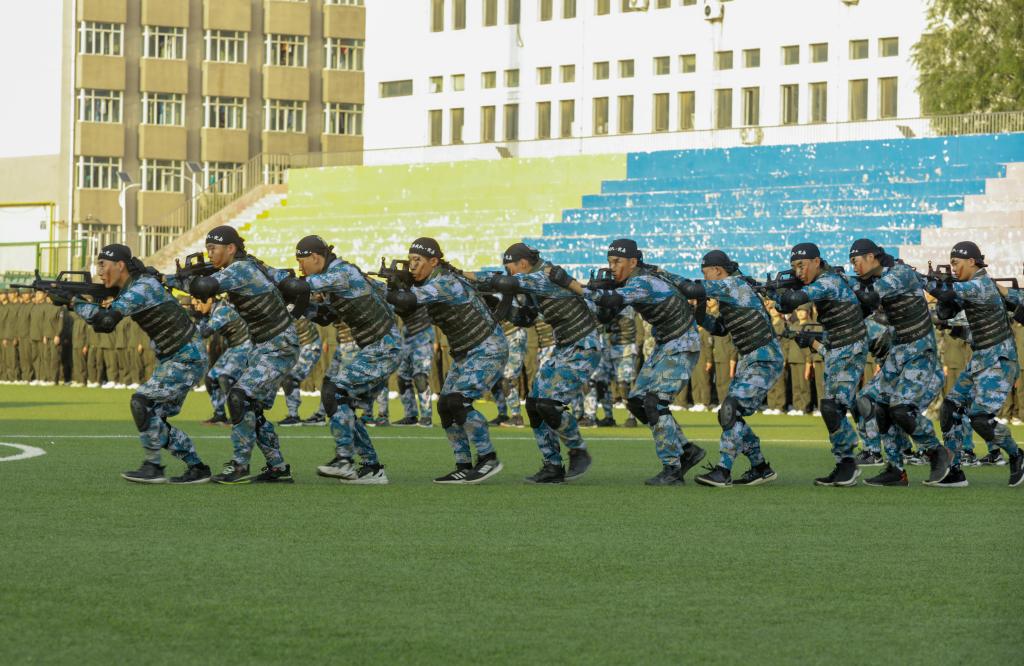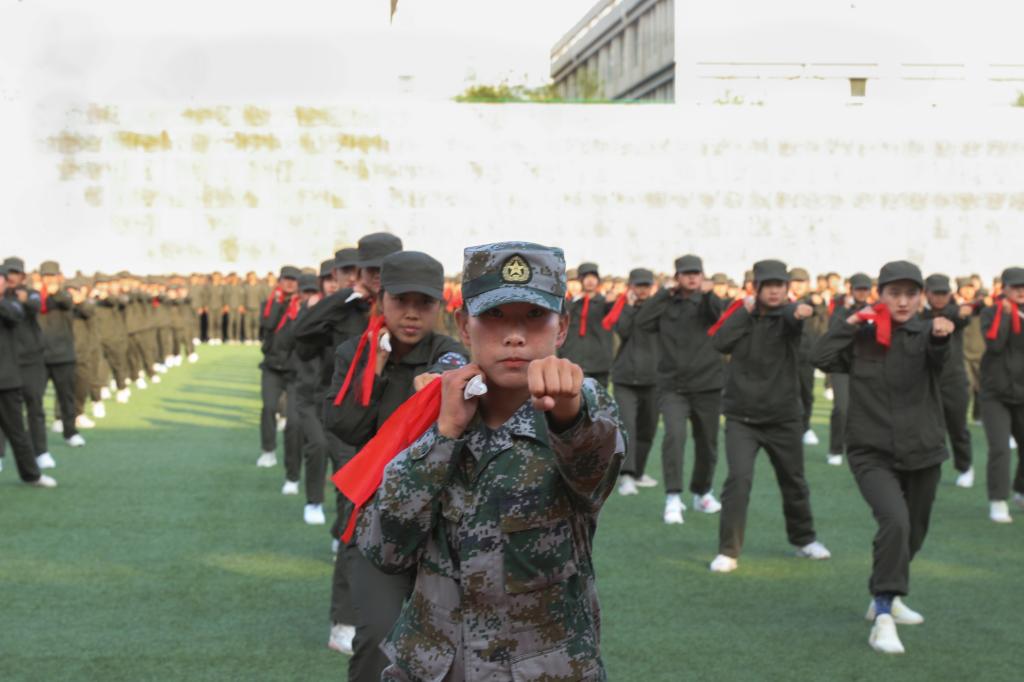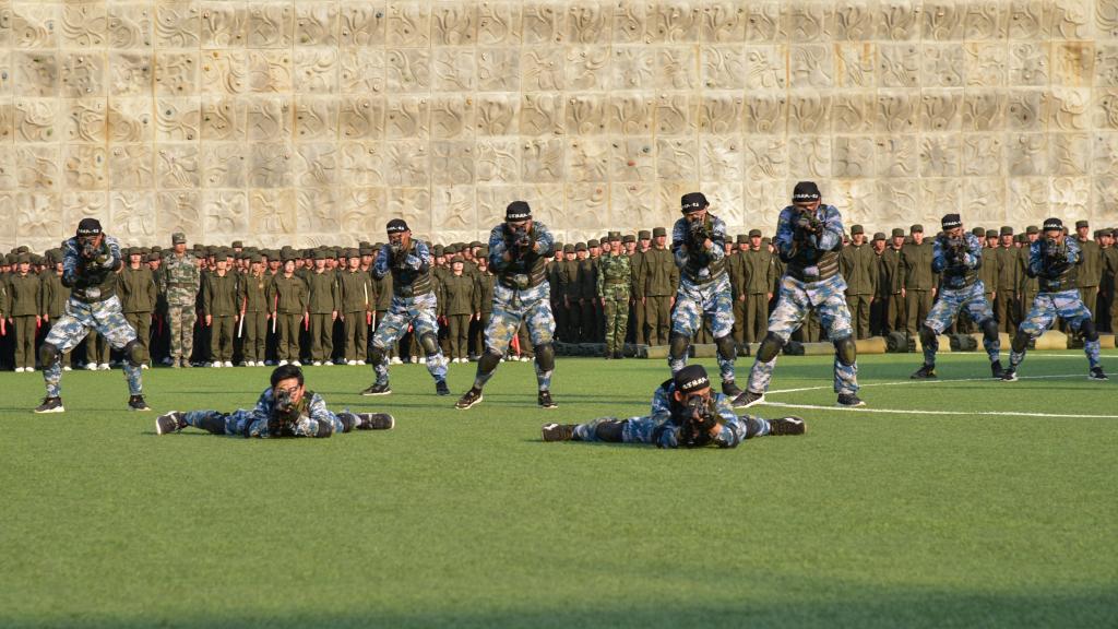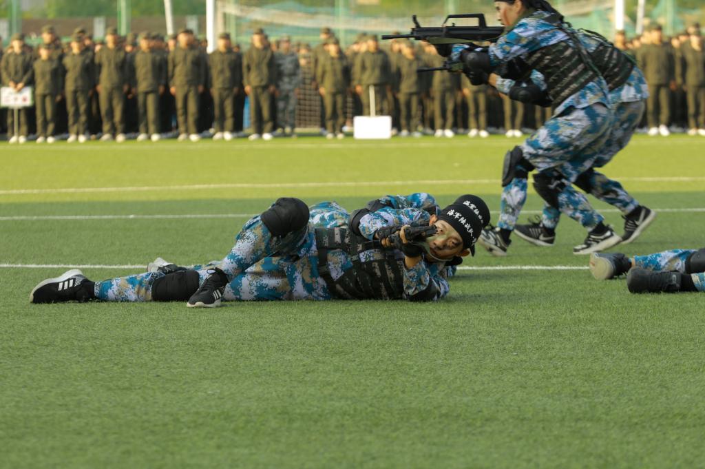 军训成果展示在庄严的国歌声中拉开帷幕。海军旗语方队舒展娴熟、整齐划一;男子拳术方队的军体拳英姿飒爽,兼具力量与速度;特种战术方队配合默契、训练有素;女子匕首操方队,身姿矫健,动作利落;内务方队有条不紊,将一个个柔软的被子叠成“豆腐块”。