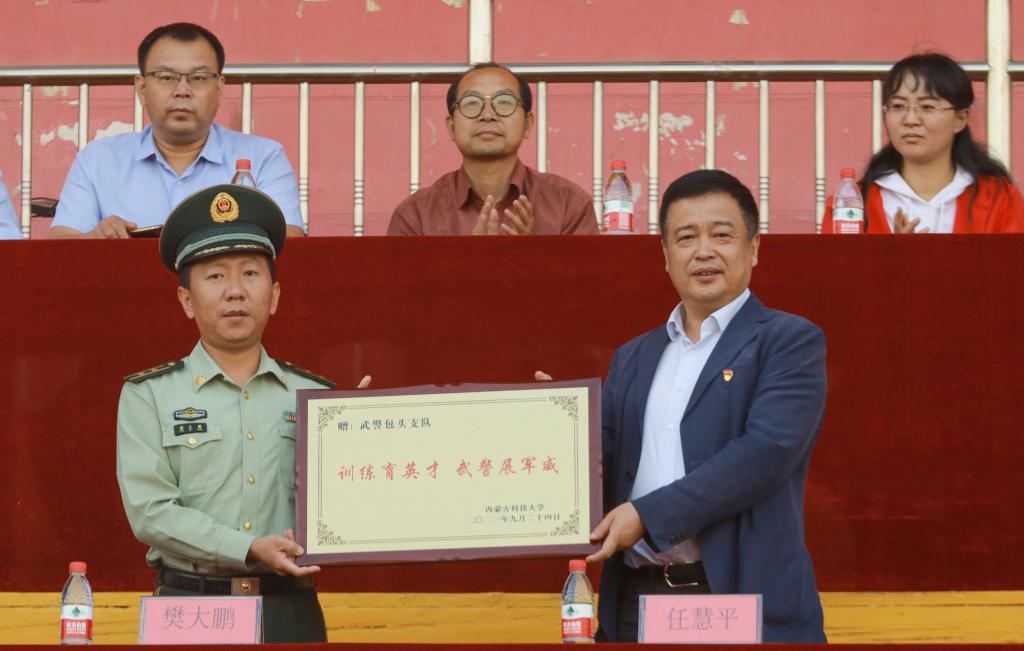 党委副书记、校长任慧平向武警包头支队赠送牌匾,感谢武警包头支队对学校军训工作的大力支持。