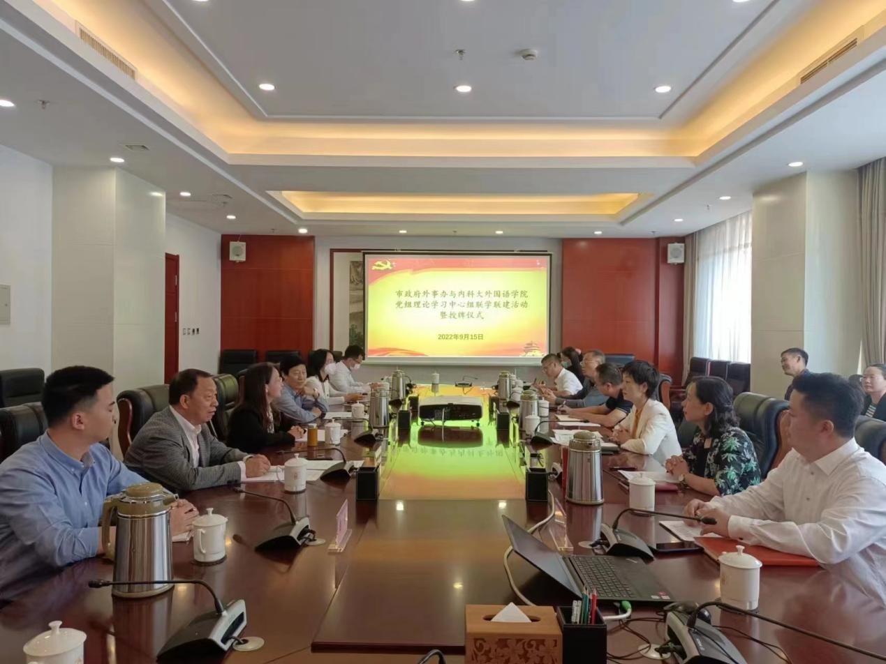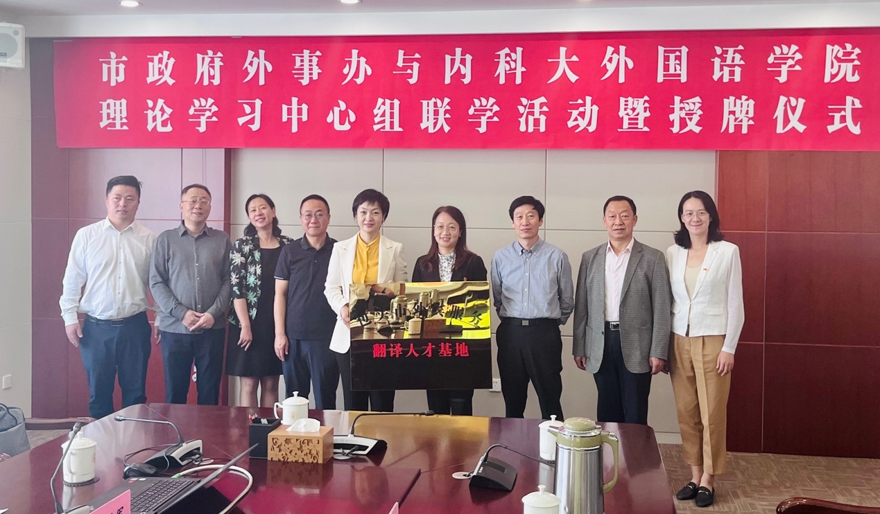 9月15日,内科大外国语学院与包头市政府外事办党组理论中心组联学活动暨授牌仪式在包头市政府外事办举行。外事办党组书记、主任冯桂莎,外国语学院党总支书记张利敏、院长耿伟出席了授牌仪式。